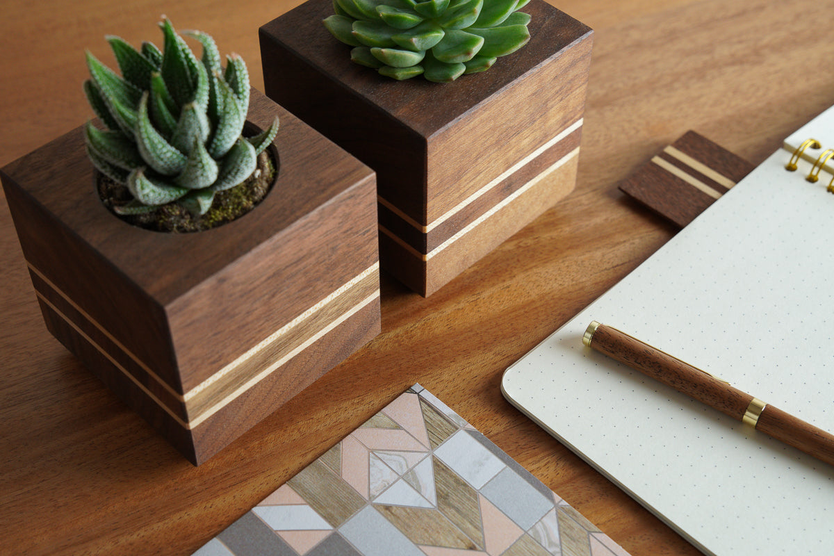 Minimalist and elegant miniature planter. Solid walnut with maple stripes through the entire piece give it a beautiful contrast. A perfect 3 inch cube with a 2.5 inch space for your succulent*.